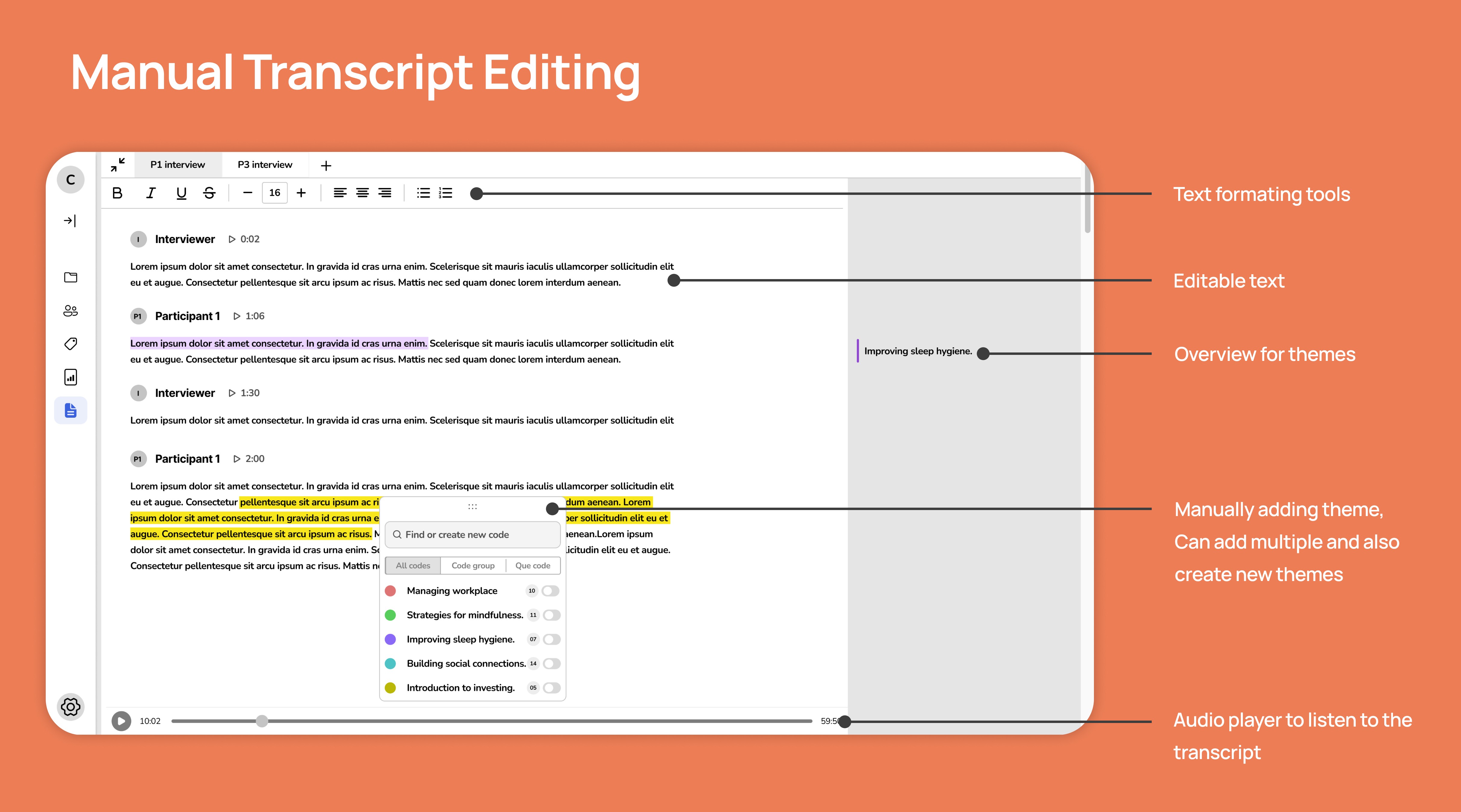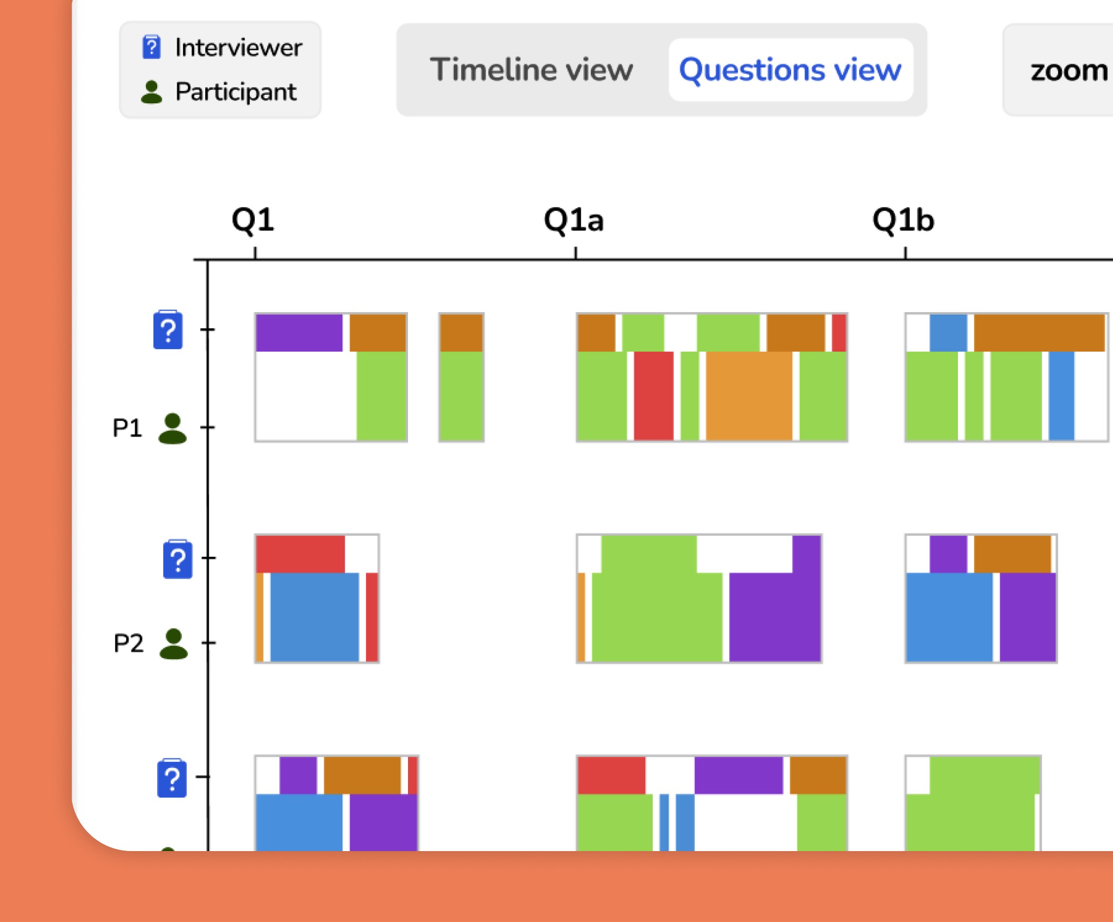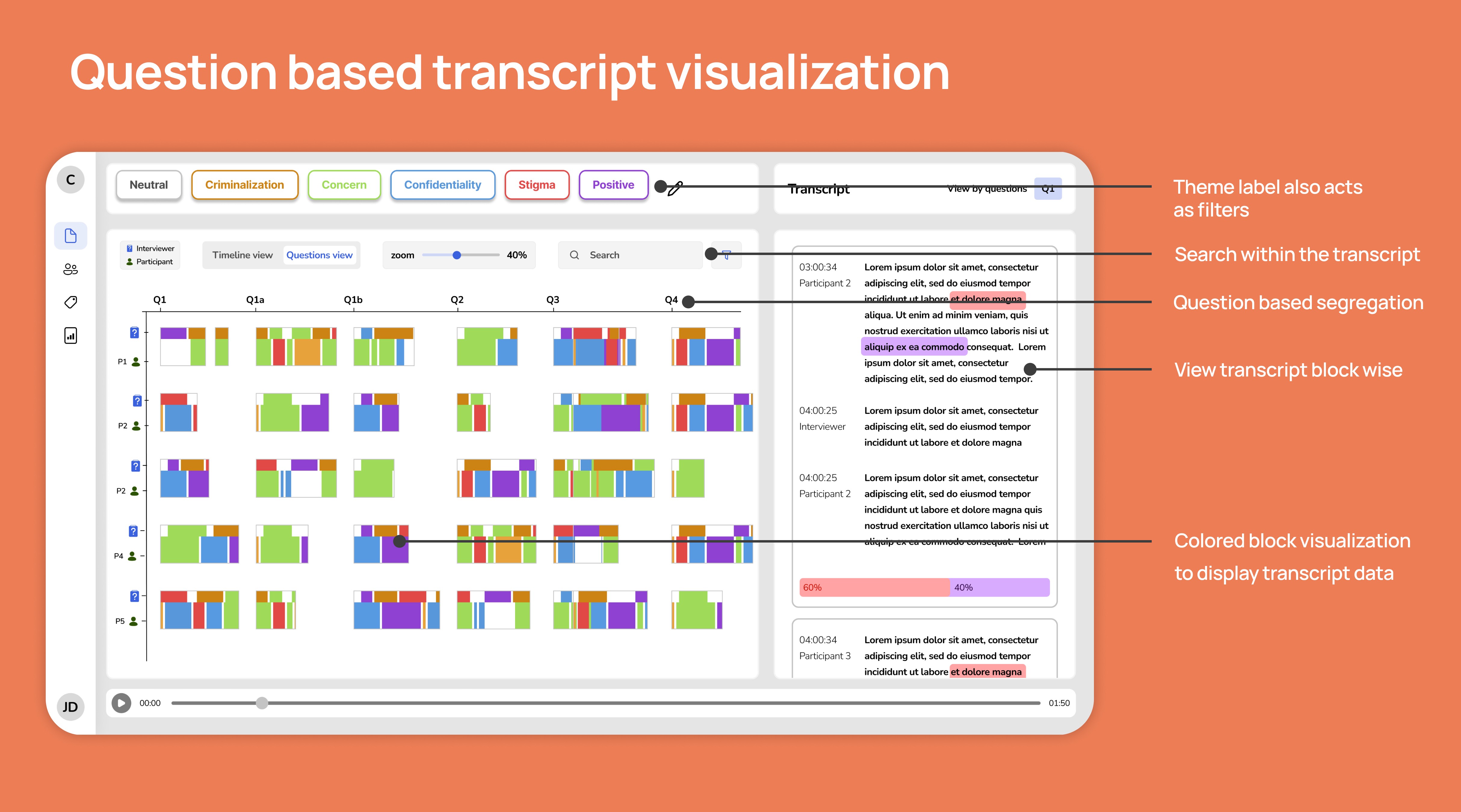 To support that, the product used a timeline-like visualization with color-coded themes across participant rows. This gave researchers a higher-level way to scan where themes appeared, then drill into transcript details when needed.